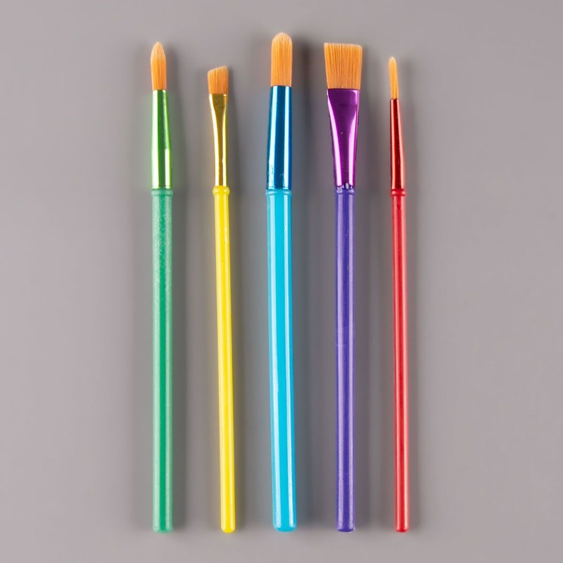 Setul include 5 pensule de diferite tipuri - plate, rotunde. Vârfurile de diferite forme din naylon asigură o aplicare lină și uniformă. Setul este potrivit pentru copii și adulți, începători și amatori. Pensula își păstrează elasticitatea atunci când este umedă.