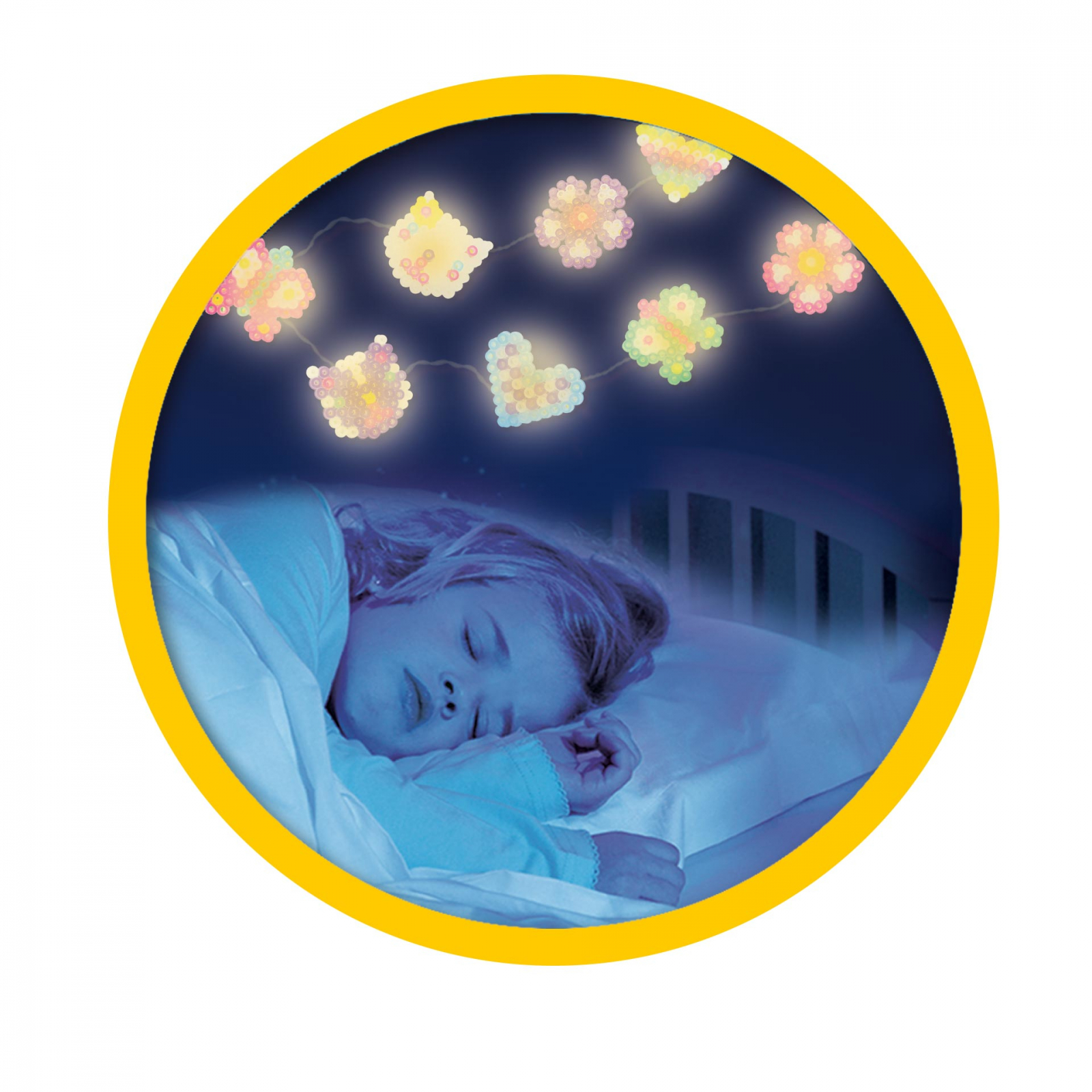 Cu acest set, iti poti face propria ghirlanda luminoasa din margele de calcat. Cu margelele si foile incluse, poti realiza cele mai frumoase figuri, precum un fluture colorat sau o floare. Ataseaza figurile la lumini cu banda de spuma si ghirlanda luminoasa cu efect de stralucire in intuneric este gata.