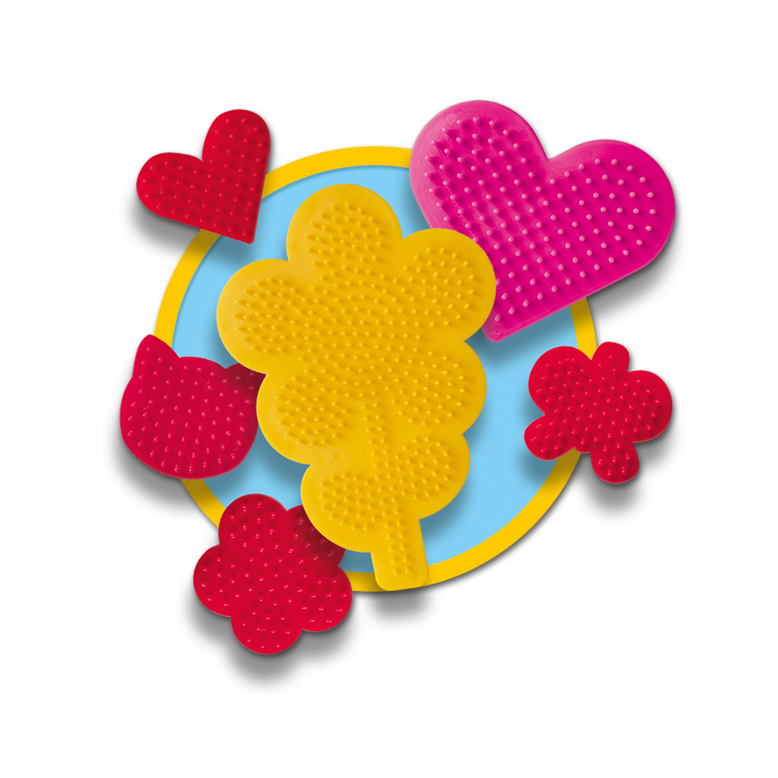 Contine: placa cu inima de calcat pe margele; placa mini cu flori de calcat pe margele; placa cu mini inima de calcat pe margele; mini bordura de calcat cu margele; mini placa de pisici de calcat pe margele; punga cu 2100 margele de calcat, inclusiv margele parfumate; hartie de calcat; autocolante cu sclipici; 2 panglici colorate.