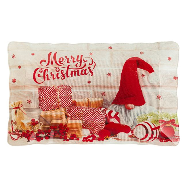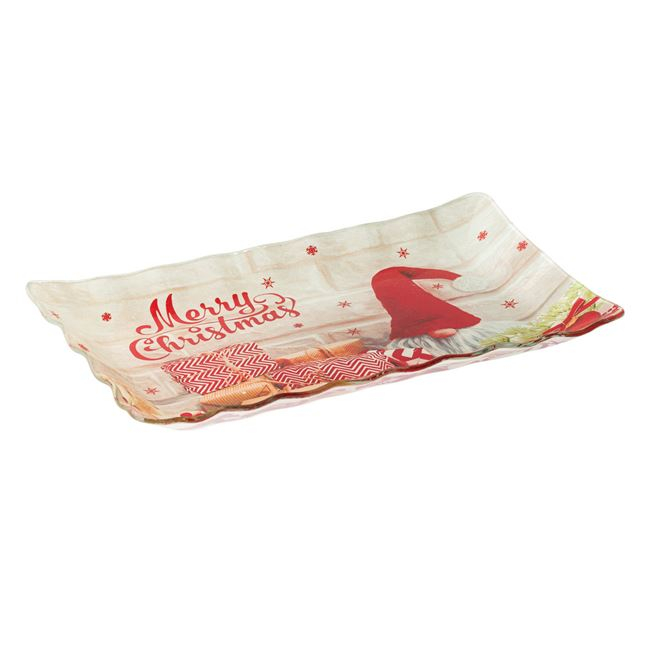 Farfurie dreptunghiulara cu margine ondulata tip platou pentru servire cu imprimeu gnom si mesaj merry christmas.