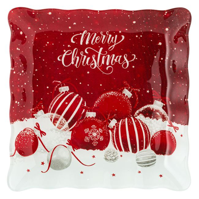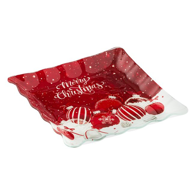Farfurie patrata desert cu margine ondulata Globulete,Rosu,Sticla,17x17 cm