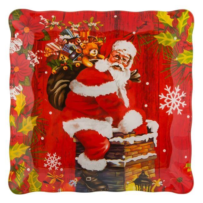 Farfurie patrata cu margini ondulata pentru desert cu imprimeu Mos Craciun cu sacul cu cadouri.