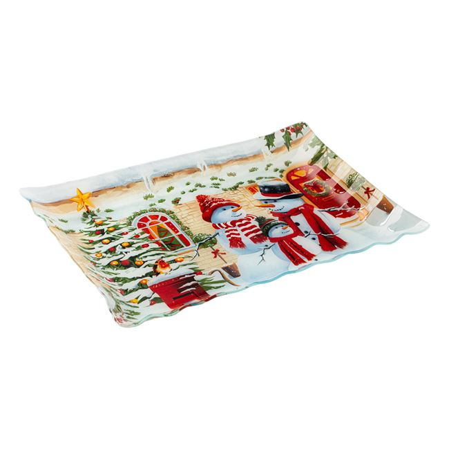 Platou dreptunghiular cu margine ondulata,Om de zapada,Sticla,36x26cm