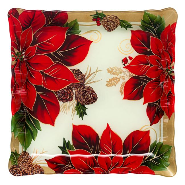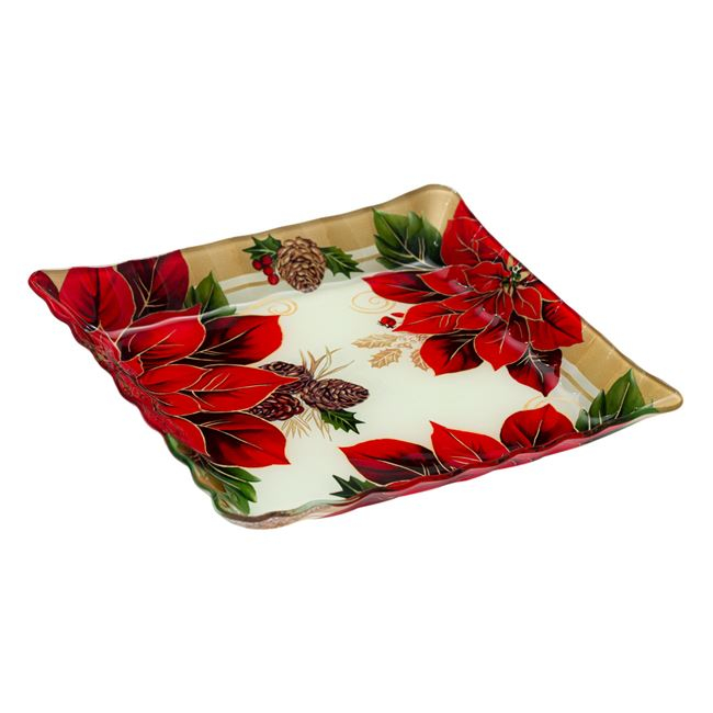 Platou pentru servire imprimeu Craciunita,Patrat,Sticla,Rosu,30x30 cm