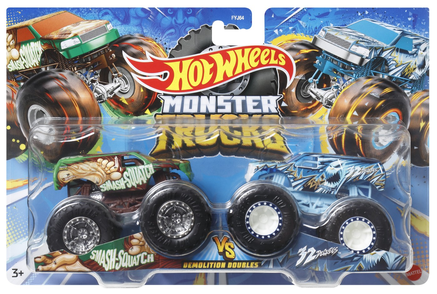 Joaca este mai interesanta cu acest set de masinute gigantice. Întorce privirea spectatorilor si pune concurentii pe fuga cu aspectul lor amenintator. Scara masinilor este 1 la 64. Culorile si decoratiunile pot varia. Setul include 2 masinute cu personajele Smash Squatch si 32 Degrees.