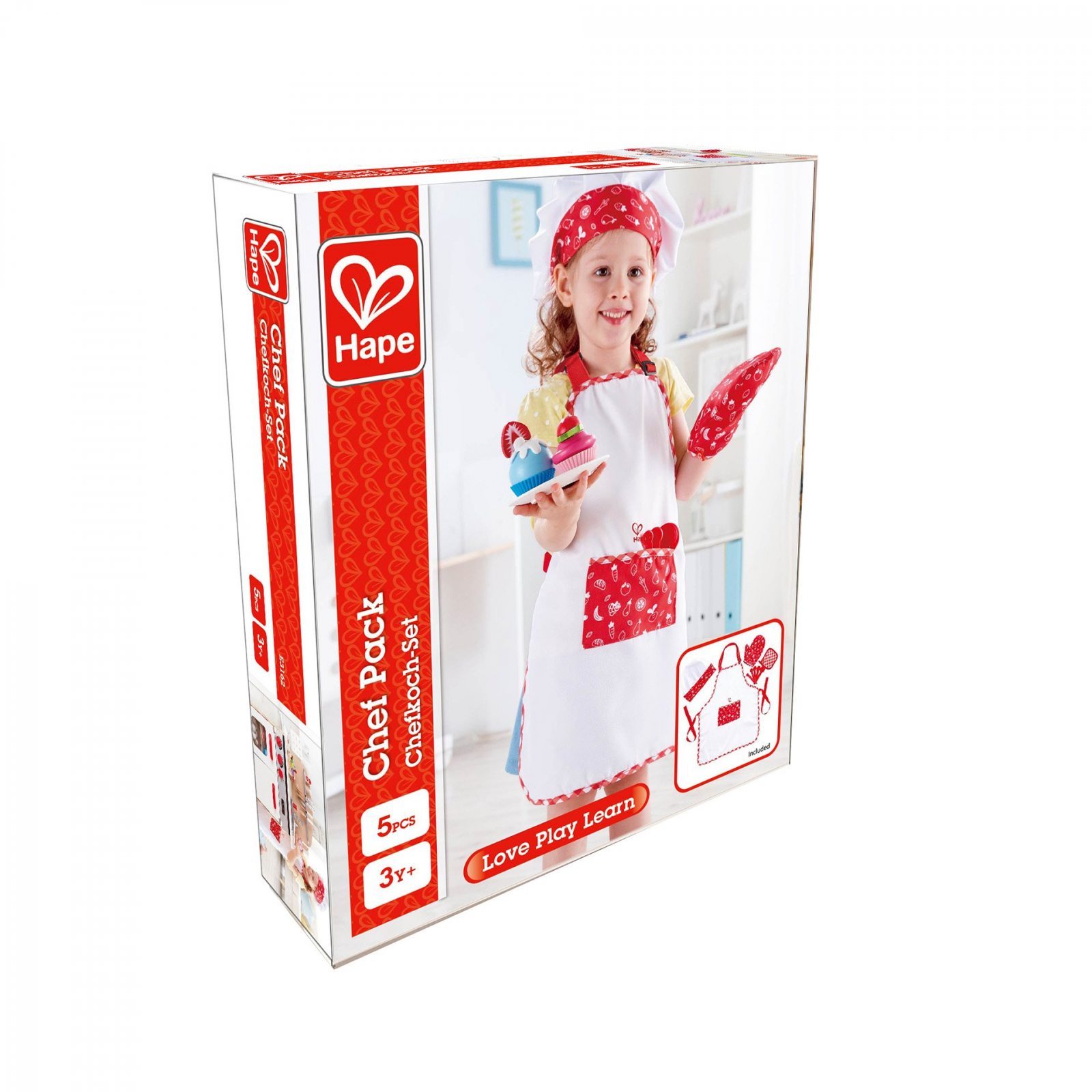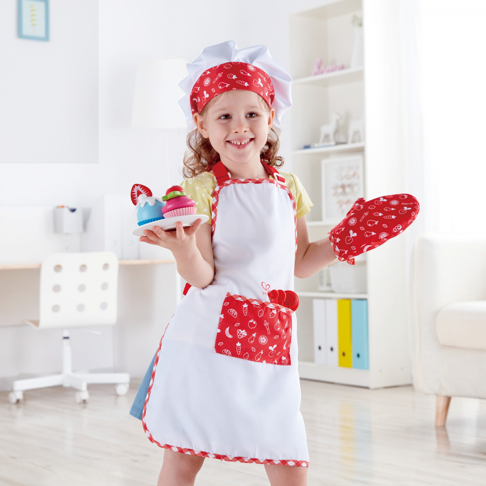 Setul de costume de bucatar este potrivit pentru jocul individual sau pentru asocierea cu alte seturi de bucatarie si mancare Hape.