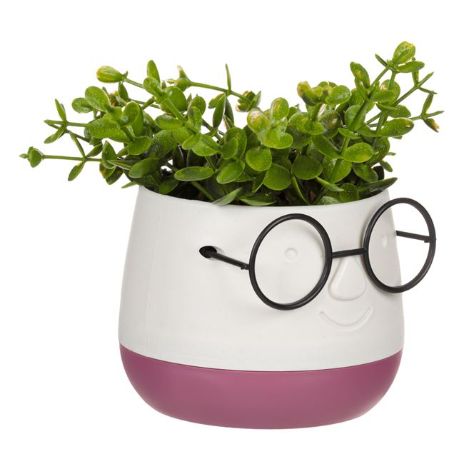 Ghiveci fata zambitoare cu planta artificiala,plastic,mov,9x14 cm
