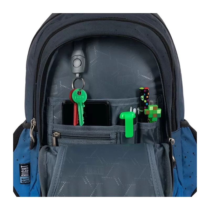 Compartimentul principal al ghiozdanului este dotat cu un buzunar special pentru a pastra diverse articole de mici dimensiuni. Unul din compartimentele frontale ale ghiozdanului este dotat cu mai multe separatoare interioare (destinate articolelor precum chei, bani, memory-stick-uri, accesorii telefon, instrumente de scris sau alte obiecte importante de mici dimensiuni), precum si cu un breloc detasabil pentru cheie.