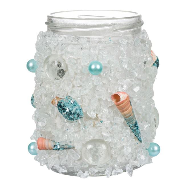Borcanul decorativ cu aplocatii de cristale,perle si scoici pentru grădină este un obiect de decor care poate fi utilizat pentru a adăuga un aspect rustic și personal la designul grădinii tale.