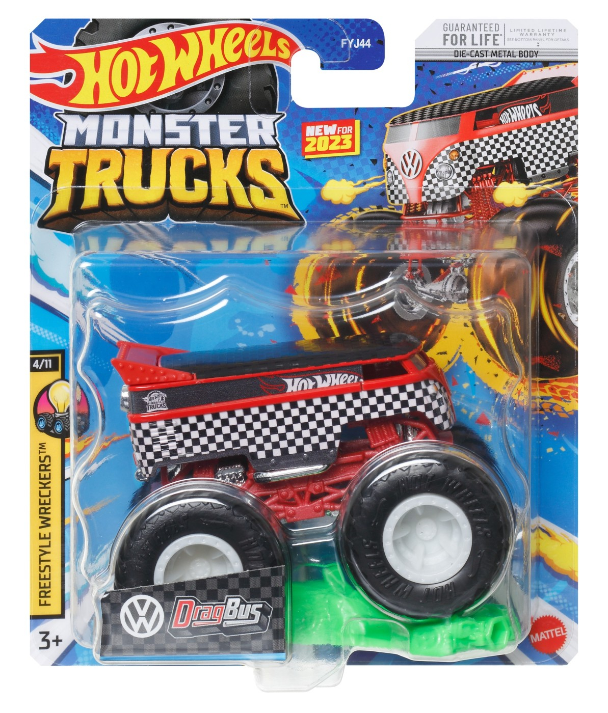 Colectioneaza masinutele Hot Wheeels gigantice pentru numeroase cascadorii. Striviti competitia cu masinuta de baza 1:64 are motoare puternice de frecare si actiuni feroce pe roti, acesti monstri sunt de neoprit. Fiecare se vinde separat, in functie de disponibilitate. Culorile si decoratiunile pot varia. Acest pachet contine personajul Drag Bus.