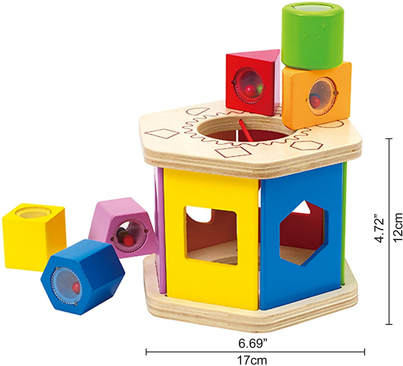 Centru de activitati. Blocurile umplute cu margele adauga o noua dimensiune a jocului acestui sorter de forme. Agitati un bloc. Roagati-va copilul sa imite sunetele pe care le-ai scos cu propriul bloc. Jucariile sunt realizate din lemn, folosind materiale ecologice, vopsite in culori atragatoare cu vopsele nontoxice, care depasesc cele mai inalte si stricte standarde internationale de siguranta si calitate, precum EN71, ISO9001, ASTM F963 si altele. De multi ani, Hape a creat jucarii fantastice, de inalta calitate, folosind materiale ecologice si durabile, fiecare produs fiind atent proiectat pentru a stimula abilitatile senzoriale, fizice si emotionale.