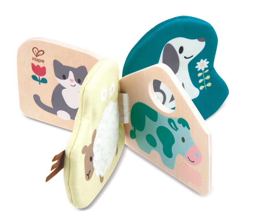 Paginile din lemn si material textil ii invita pe micutii tai la primele lor aventuri cu Hape Baby Book Bella. Aceasta carte pentru copii are pagini frumos ilustrate cu animale, cum ar fi un pui, porc si pisica cu care copilul dumneavoastra se poate familiariza in timp ce rasfoieste paginile de lemn. Fiecare pagina are, de asemenea, cateva efecte speciale pentru a le stimula simturile, cum ar fi o oglinda, folie trosnitoare si alte materiale stimulatoare care tin copilul conectat cu cartea. Creeaza povesti pentru bebelusul tau folosind prima sa carte si tine-o aproape cu ajutorul unui inel practic care il face usor tinut de mainile mici si atasat de patut sau carucior. Slabiti cureaua velcro, astfel incat sa puteti spala cu usurinta partile laterale din materiaL. Jucariile sunt realizate din lemn, folosind materiale ecologice, vopsite in culori atragatoare cu vopsele nontoxice, care depasesc cele mai inalte si stricte standarde internationale de siguranta si calitate, precum EN71, ISO9001, ASTM F963 si altele. De multi ani, Hape a creat jucarii fantastice, de inalta calitate, folosind materiale ecologice si durabile, fiecare produs fiind atent proiectat pentru a stimula abilitatile senzoriale, fizice si emotionale.