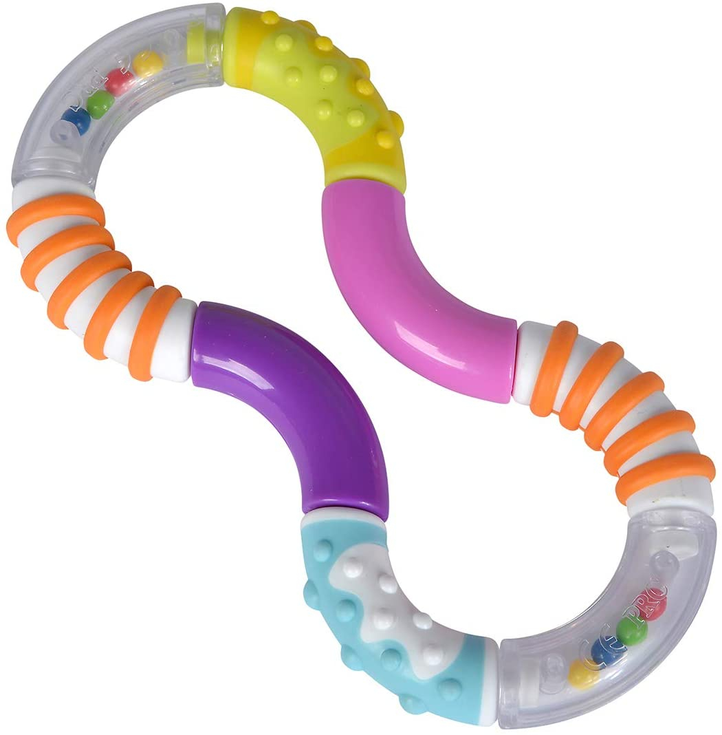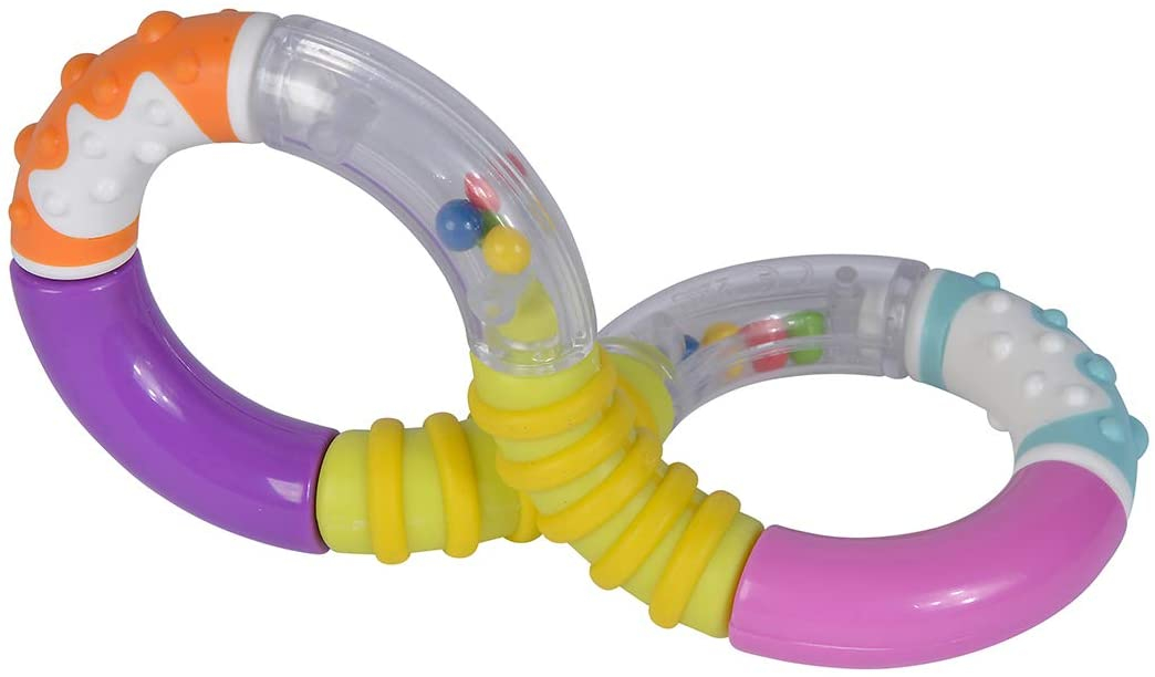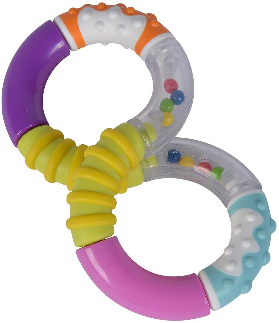 Jucarie zornaitoare in forma de cifra 8 ce are o lungime de 16cm. Jucarie este viu coloarata, cu mai multe tipuri de material, pentru a-i ajuta pe bebelusi pentru calmarea durerilor de dinti si bile in interiorul acesteia pentru zgomot.