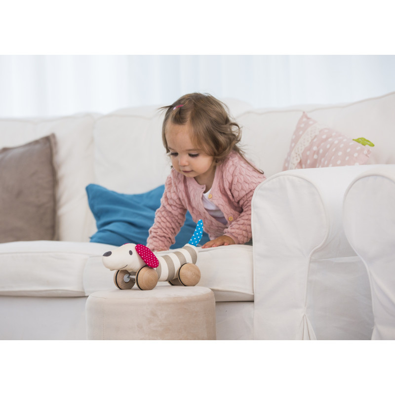 Cainele „Hugo” este facut din diverse tesaturi colorate si un tovaras fidel. Se lasa tras de un snur in timp ce se clatina fericit inainte si inapoi. Hugo il incurajeaza pe micul tau iubitor de animale de la 12 luni sa faca primele incercari de mers pe jos si calatorii de descoperire. El devine repede cel mai iubit aliat! Jucariile sunt realizate din lemn, folosind materiale ecologice, vopsite in culori atragatoare cu vopsele nontoxice, care depasesc cele mai inalte si stricte standarde internationale de siguranta si calitate, precum EN71, ISO9001, ASTM F963 si altele. De multi ani, Hape a creat jucarii fantastice, de inalta calitate, folosind materiale ecologice si durabile, fiecare produs fiind atent proiectat pentru a stimula abilitatile senzoriale, fizice si emotionale.