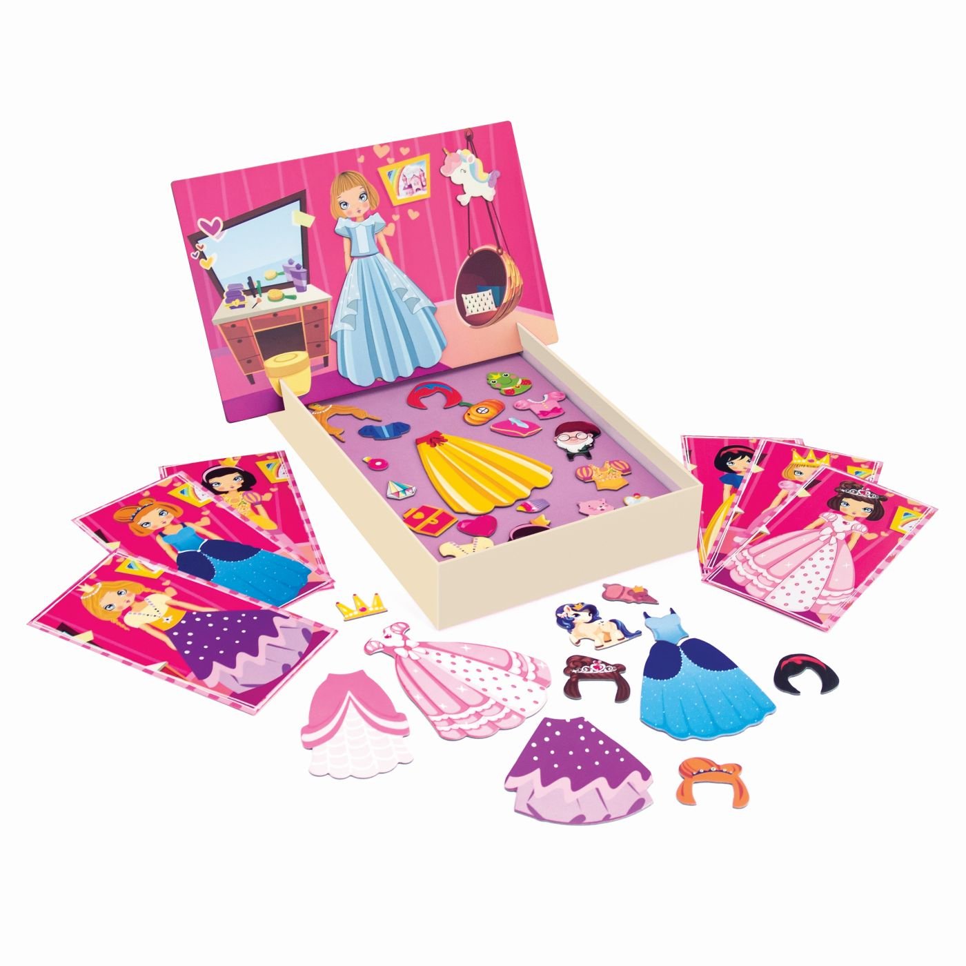 Printesele te invita intr-o lume plina de culoare si fantezie! Combina cele 34 de piese din carton cu magneti – rochii, coafuri si accesorii – pentru a crea cele mai frumoase printese. Poti urma modelele de pe cele 7 carti incluse sau iti poti lasa imaginatia libera si sa creezi propriile tale tinute regale. Jocul ofera multiple posibilitati de joaca prin imitatie, stimuland creativitatea, atentia si coordonarea copiilor. Te poti juca impreuna cu prietenii sau parintii, inventand povesti magice despre printesele tale preferate. Poti chiar sa masori rochiile si accesoriile sau sa le desenezi contururile pe hartie pentru a le colora. O activitate educativa si creativa care ii tine pe copii departe de ecrane si le ofera ore intregi de distractie imaginativa. Contine: 34 de magneti din carton, 1 plansa magnetica.