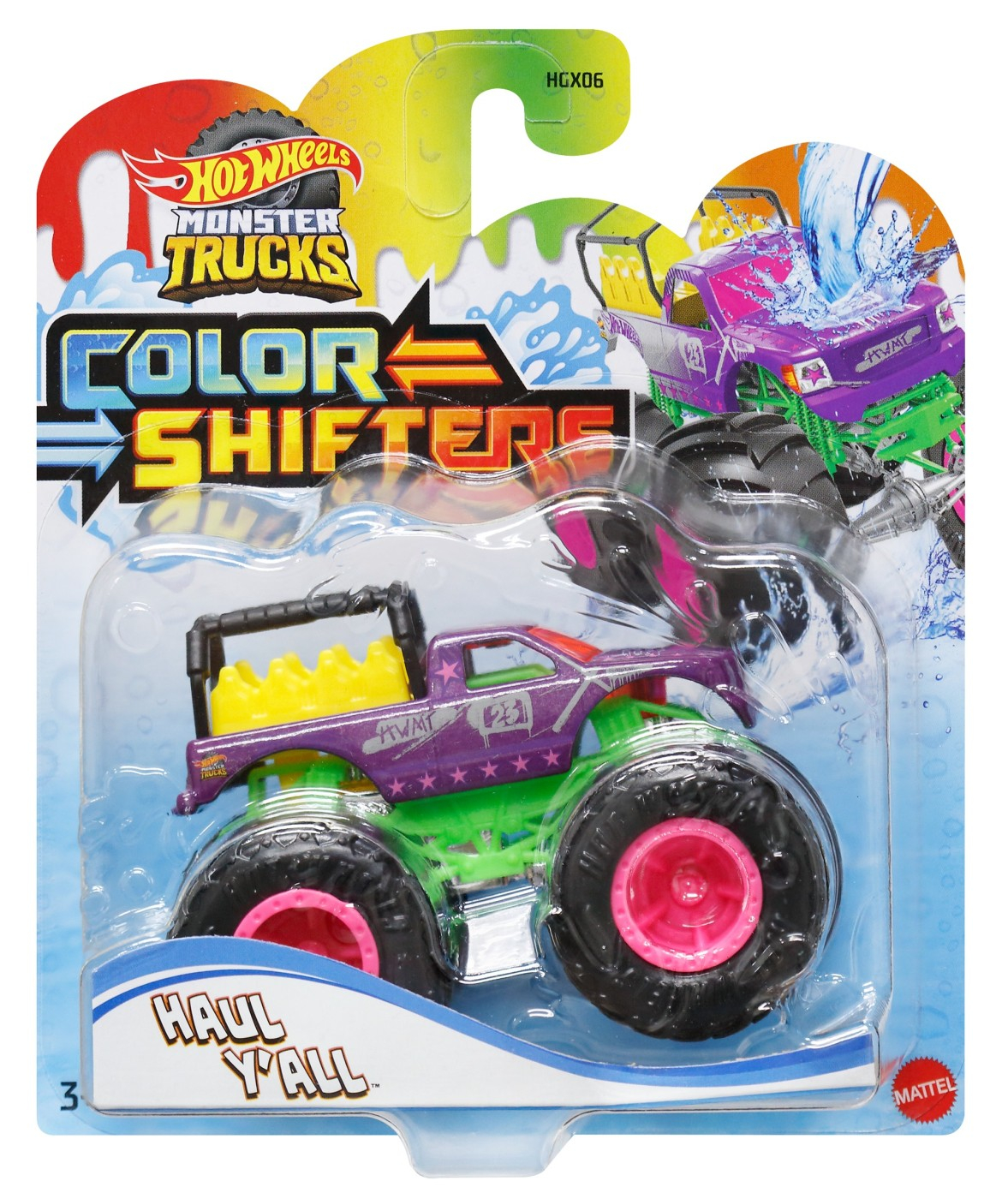 Camioanele Hot Wheels Monster Trucks 1:64 Color Shifters Trucks ofera zdrobire si prabusire cu bonusul a doua decoruri pe un singur camion! Pur si simplu scufundati camionul Color Shifters in apa rece ca gheata pentru a-si schimba in mod magic aspectul initial, apoi schimbati-l inapoi scufundandu-l in apa calda. Repetati procesul de mai multe ori pentru a alterna modelele. Avand la dispozitie atat de multe Camioane Monster Color Shifters minunate, copiii vor dori sa le adune pe toate. Fiecare se vinde separat, in functie de disponibilitate. Culorile si decoratiunile pot varia. Acest pachet contine personajul Haul Y'All.