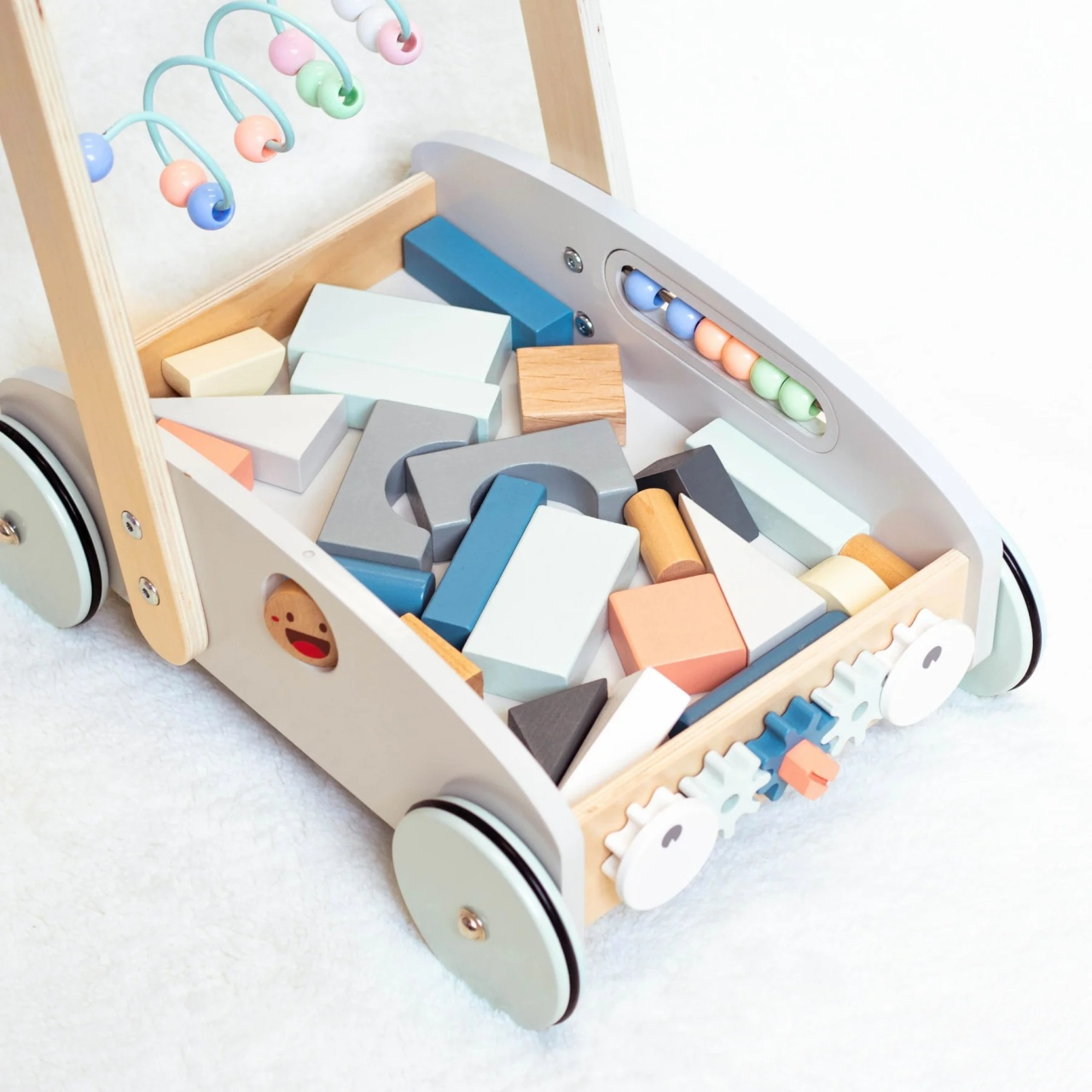 Premergator albastru 5 in 1 Cărucior din lemn pentru copii cu centru de activități integrat, însoțitorul perfect pentru primii pași și primele aventuri. Căruciorul multifuncțional oferă multe activități distractive și educative pe lângă faptul că este un ajutor pentru mers: sortarea și stivuirea blocurilor, rotirea angrenajelor, rularea și rotirea mărgelelor, rotirea feței zâmbitoare. Pe măsură ce micuțul explorează fiecare activitate, va dezvolta abilități esențiale și va descoperi bucuria rezolvării jocurilor. Roțile prevăzute cu bandă de cauciuc ale premergătorului sunt concepute pentru a proteja podelele de zgârieturi, oferind stabilitate și o experiență de joacă fără griji. Are margini netede și o durabilitate ridicată. Dimensiuni căruț asamblat: 43 x 28 x 40 cm. Cadou ideal pentru botez, zi de naștere, Crăciun. Vârsta recomandată: +12 luni sub supravegherea unui adult. Confecționat din lemn cu vopsele ecologice pe bază de apă. Conform EN71&ASTM cu certificare CE. AVERTISMENT: Contraindicat copiilor sub 12 luni! Se recomandă supravegherea copilului de către un adult în timpul jocului. Produs în China pentru UMU Toys, Cehia.