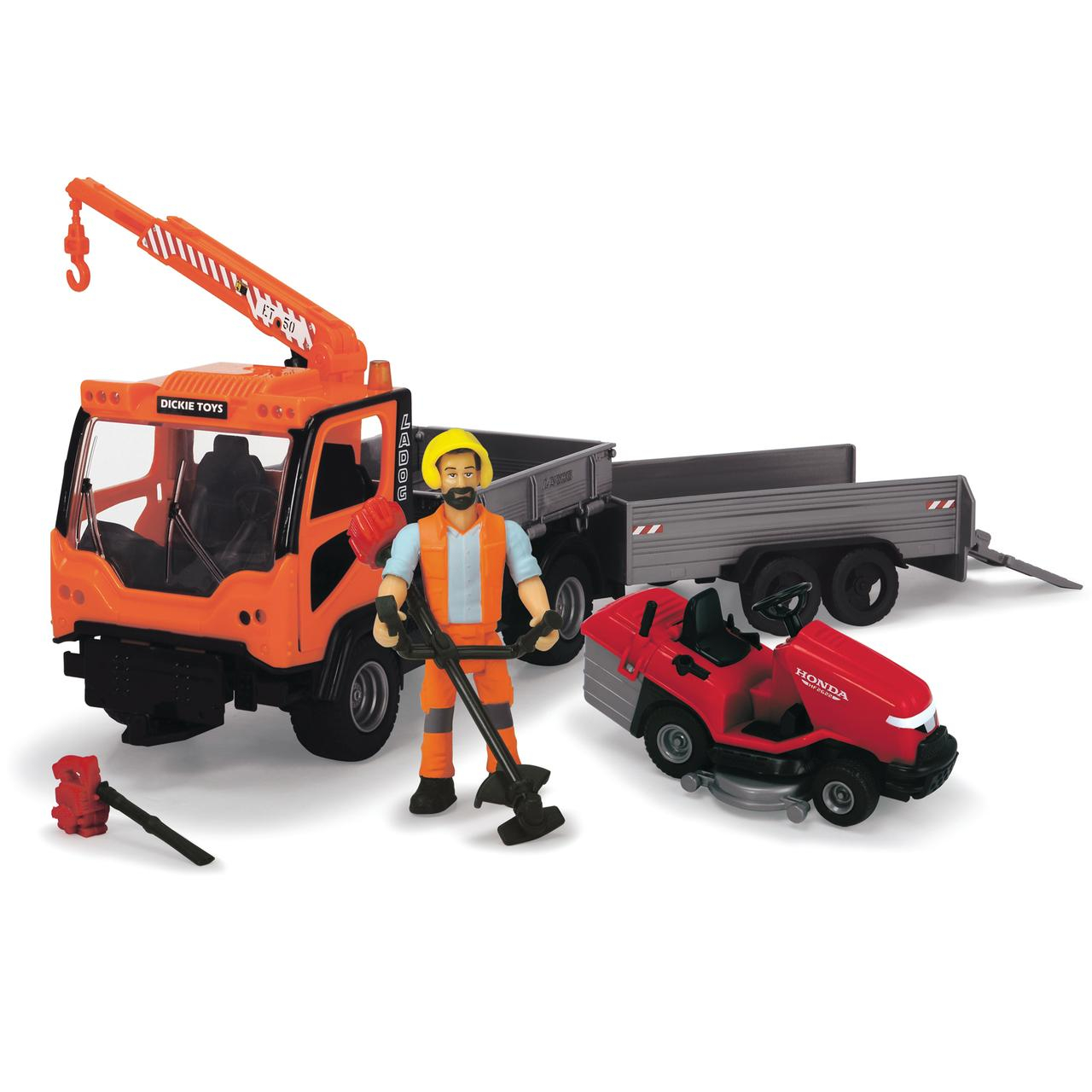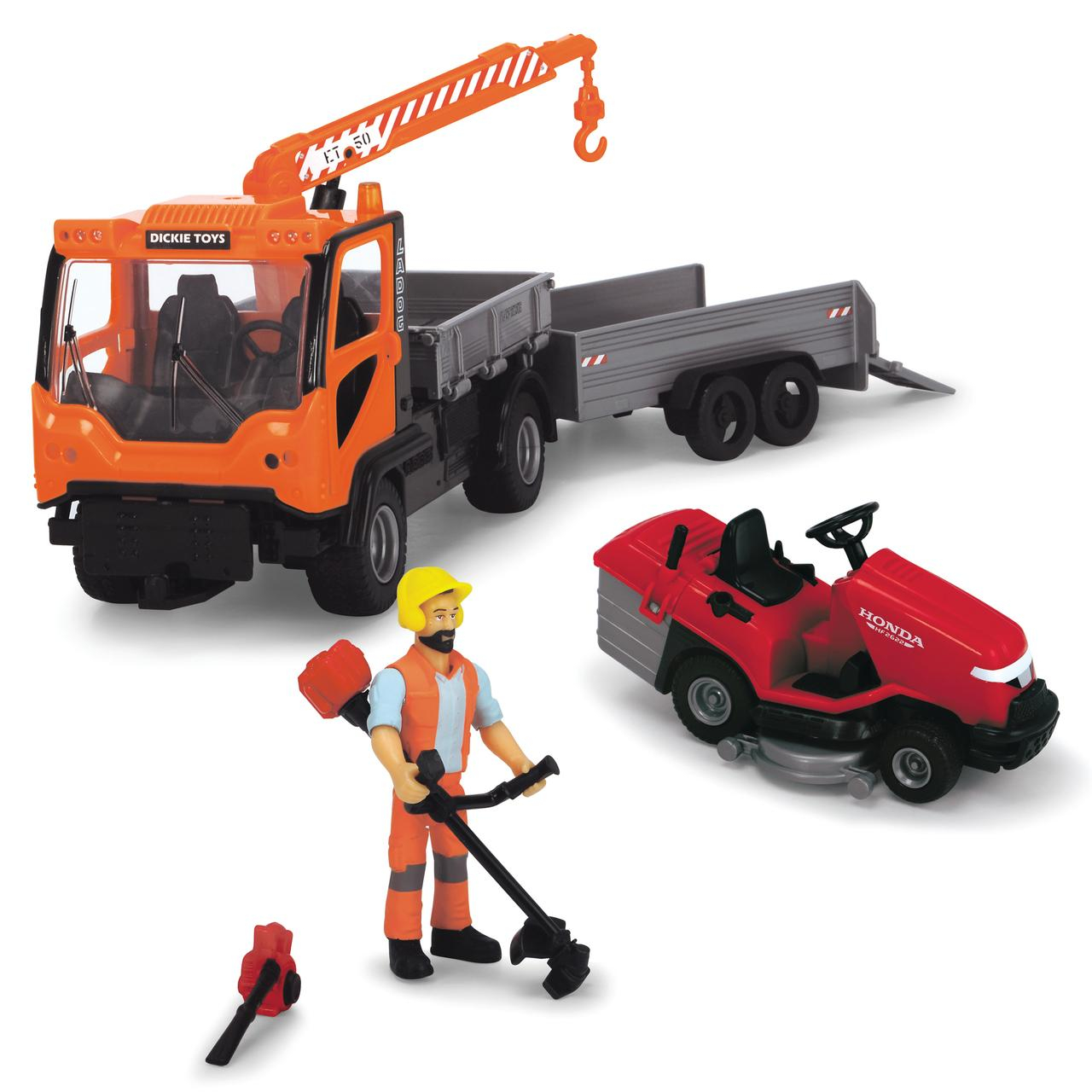 Set aventura din gradina: pentru toate lucrurile verzi Cand vine vorba de ingrijirea gazonului in Toy Town, totul este ingrijit cu setul de gradini. Camionul cu macara Ladog T-1700 cu remorca, figurina si o gama larga de accesorii asigura acest lucru. Toate caracteristicile au fost proiectate in conformitate cu modelele mai mari, la scara 1:24 si au multe functii. Masina de tuns iarba HF2622 are un cos care se deschide si o masina de tuns iarba care se misca. Figurina se poate juca cu suflanta de frunze Honda si poate tunde gazonul. Bratul macaralei Ladog T 1700 este la fel de manevrabil ca peretii laterali si platforma.