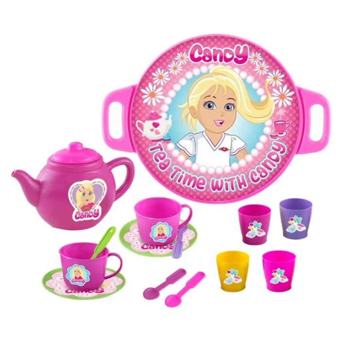 Setul include:tava de servire, ceainic, cesti, pahare, farfurii si lingurite.