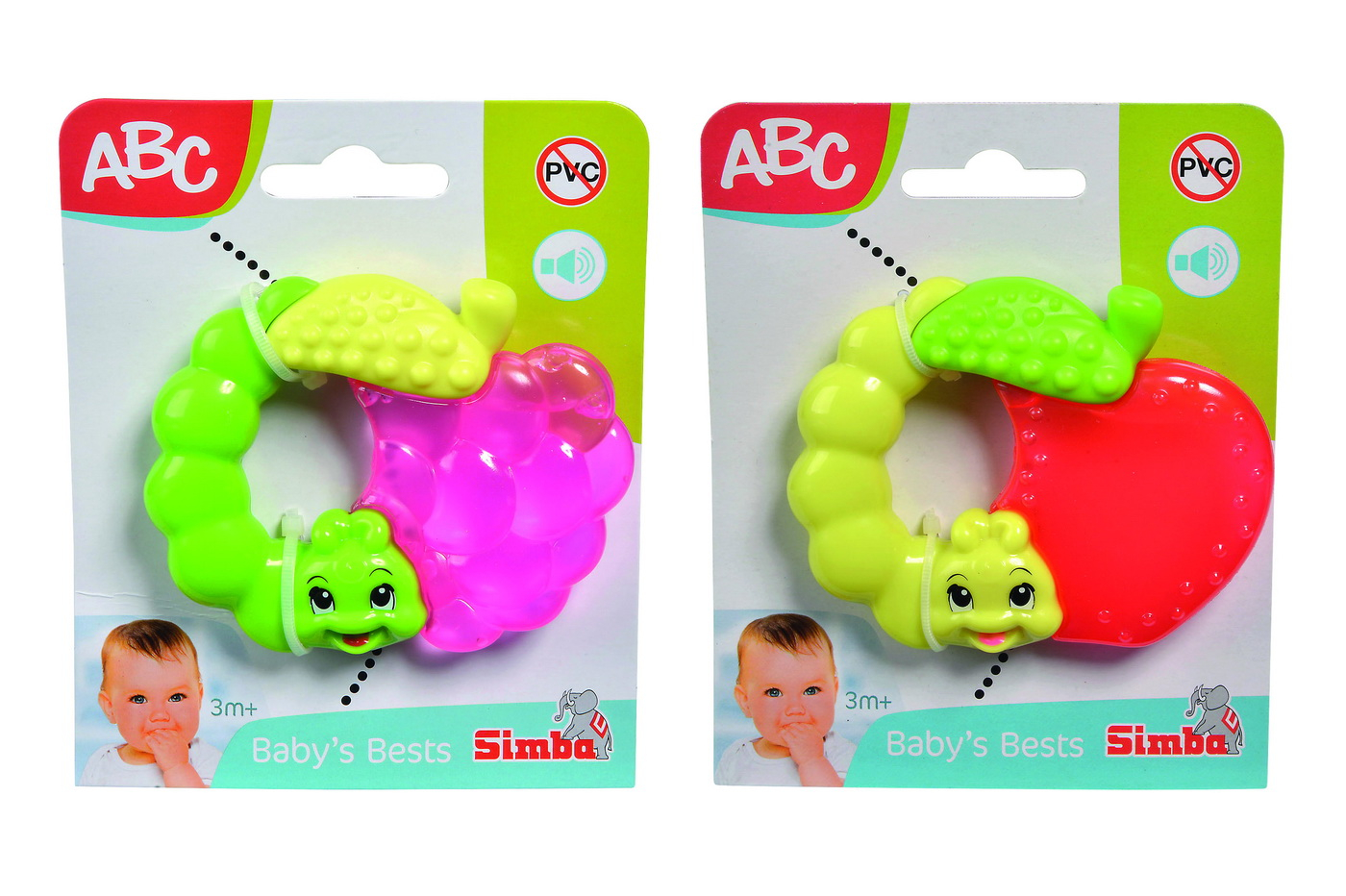 Jucarie refrigeranta marca Simba Baby cu corp plastic moale, contine apa sterilizata. Racire se face la frigider (nu congelator), relieful alina durerile cauzate de primii dinti. Curatarea se face cu apa calda si sapun, apoi bine.  Nu fierbeti produsul pentru sterilizare. Sterilizarea se face la rece. Jucaria este disponbila in doua forme, de mar si de mure.