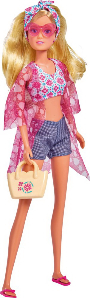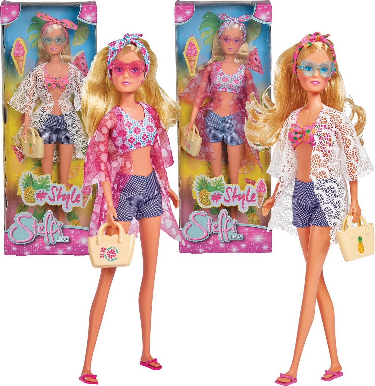 Steffi poarta o rochie la moda, asortata cu o bentita, ochelari de soare si geanta. Inaltime papusii este de 29 cm. Steffi Love este o adevarata papusa de moda. Ii plac hainele elegante, coafurile cu stil, sora ei mica Evi si bineinteles iubitul ei Kevin. Fetele isi pot stiliza si imbraca papusa in cele mai noi tendinte ale modei.