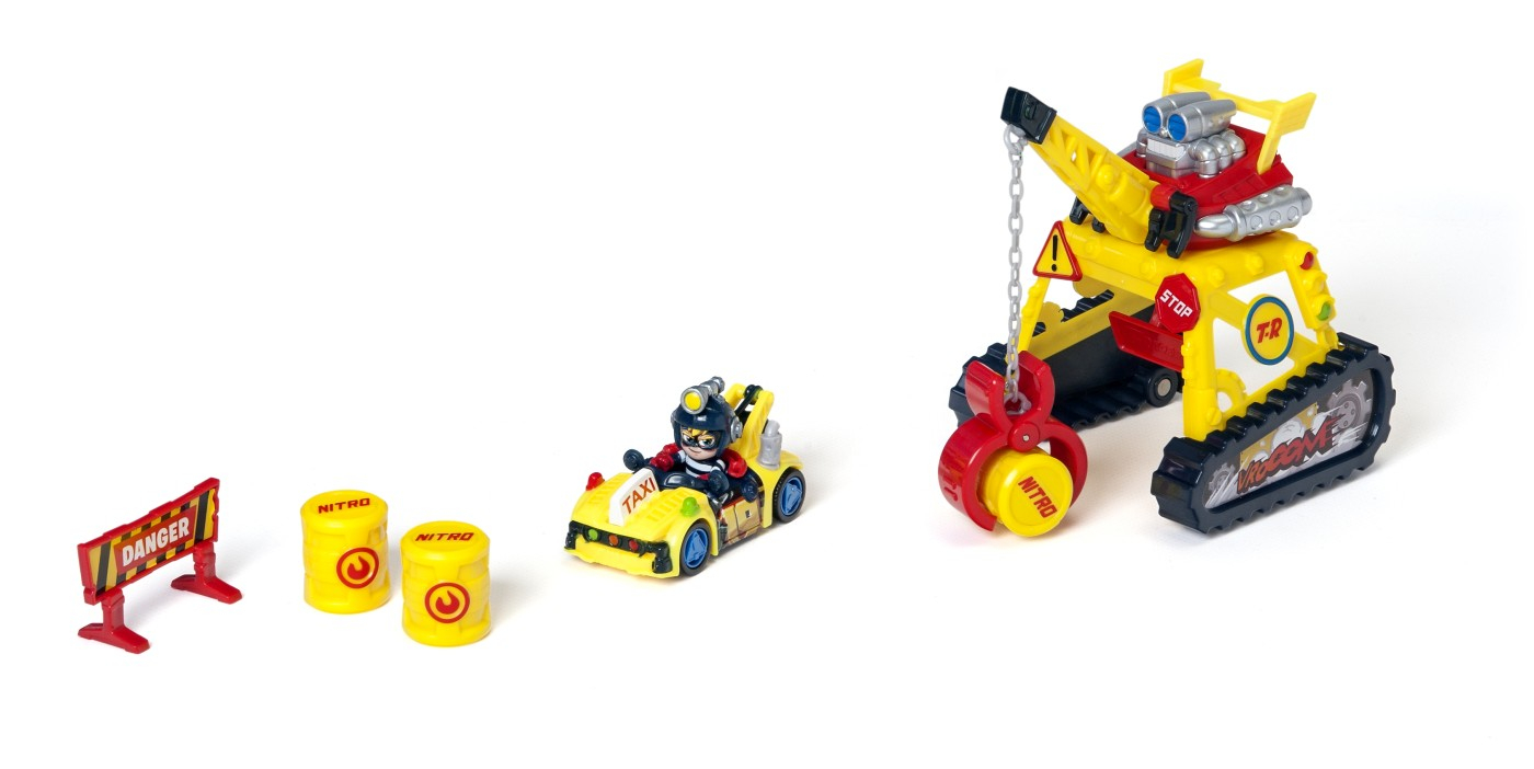 Noua provocare de la T-Racers, Provocarea Turbo! Macaraua motorizata se afla intre Mr. Meaner si pista de cursa. Va putea trece pe dedesubt fara sa se ciocneasca de carlig, butoaie si gard? Daca va reusi va deveni campionul din orasul Turbo! Viteza sa ii va trimite pe dusmanii sai in zbor si apoi isi va putea continua calatoria cu viteza maxima pentru a iesi castigator. 3… 2… 1… Porneste! Aminteste-ti ca iti poti schimba toate piesele vehiculelor tale T-Racers, inclusiv rotile si pilotii, pentru a personaliza orice vehicul exact asa cum iti doresti. Exista peste 500 de combinatii posibile! Setul de joaca contine: 1 pilot si 1 vehicul exclusiv T-Racer, 1 macara, 1 gard, 3 butoaie. Setul de joaca include: 1 sofer + 1 vehicul exclusiv T-Racer, 1 macara, 1 gard, 3 butoaie.