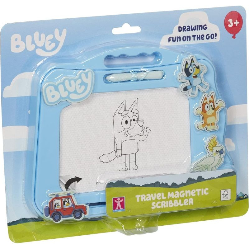 Tabla de desen Bluey le va permite copiilor sa deseneze personajele lor preferate de desene animate. Un tanar ilustrator incepator nu trebuie sa-si faca griji ca nu poate inca sa transmita pe deplin forma unui caine. El va fi ajutat de stampile cu imagini cu Bluey, Bingo si un papagal, pe care il poate urmari! Znikopisul albastru este usor si la indemana - potrivit pentru calatorii. Creionul magnetic este asezat pe o sfoara pentru ca copilul sa nu-l piarda.