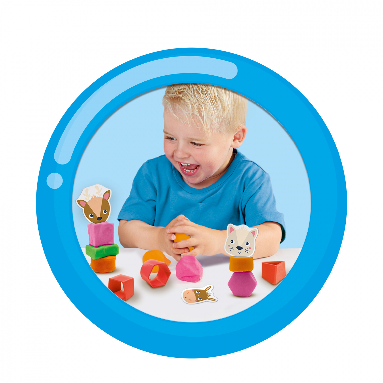 Contine: plastilina albastra deschis (90g); plastilina portocalie (90g); plastilina roz (90g); plastilina verde (90g); 3 freze (6 forme); sucitor din lemn; figurine de animale din carton.