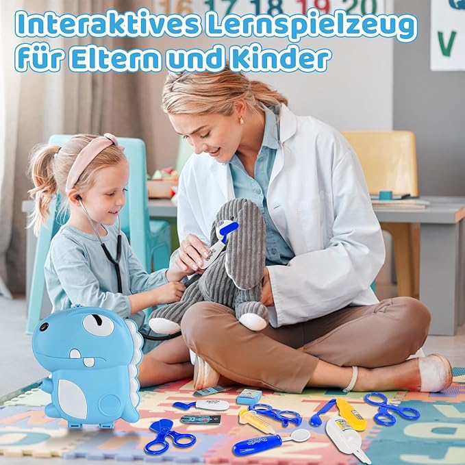 Acest set de joacă adorabil, în formă de gentuță dinozaur, îi permite copilului să se joace de-a doctorul oriunde ar merge! Setul include o varietate de accesorii medicale precum stetoscop, termometru, seringă și alte ustensile, toate depozitate într-o gentuță albastră cu design de dinozaur, perfectă pentru micii exploratori și iubitori de dinozauri.